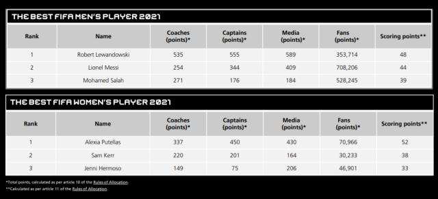 在最终的得分榜上,莱万多夫斯基拿到48分的总分,得以力压44分的梅西蝉联世界足球先生。在上述的4个投票主体中,梅西只在球迷投票中超过了莱万,得分是莱万的整整两倍。不过在另外三项评选中,梅西全面落后。