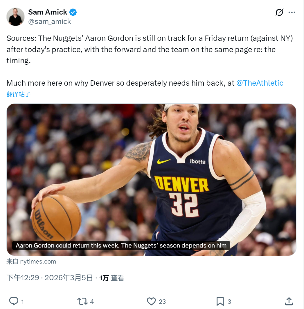丹佛掘金终于等来两个好消息。第一个,签下大卫-罗迪,裁掉贝茨。角色球员,无关痛痒。第二个,阿隆-戈登将在后天对阵尼克斯的比赛中正式复出。这一个,能改变西部格局。戈登因腿筋拉伤,已经连续缺席16场比赛。这16场,掘金7胜9负,从西部第三一路跌到第五。目前38胜24负,落后第三的火箭和第四的森林狼都是1个胜场。1个胜场的差距,可能就是季后赛主场优势的区别。掘金主...