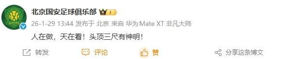 而在足协开出重磅罚单后,不少球队也第一时间回应了处罚。而北京国安官方回应耐人寻味。国安官微愤怒写道:“人在做,天在看,头顶三尺有神明!”