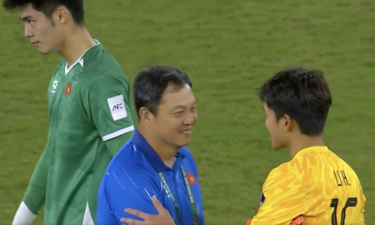 1月22日讯 中国U23男足半决赛击败越南U23,赛后李昊与对方门将拥抱致意。越南队门将教练李云在上前与李昊亲切交流,上演“宠溺”摸头杀。